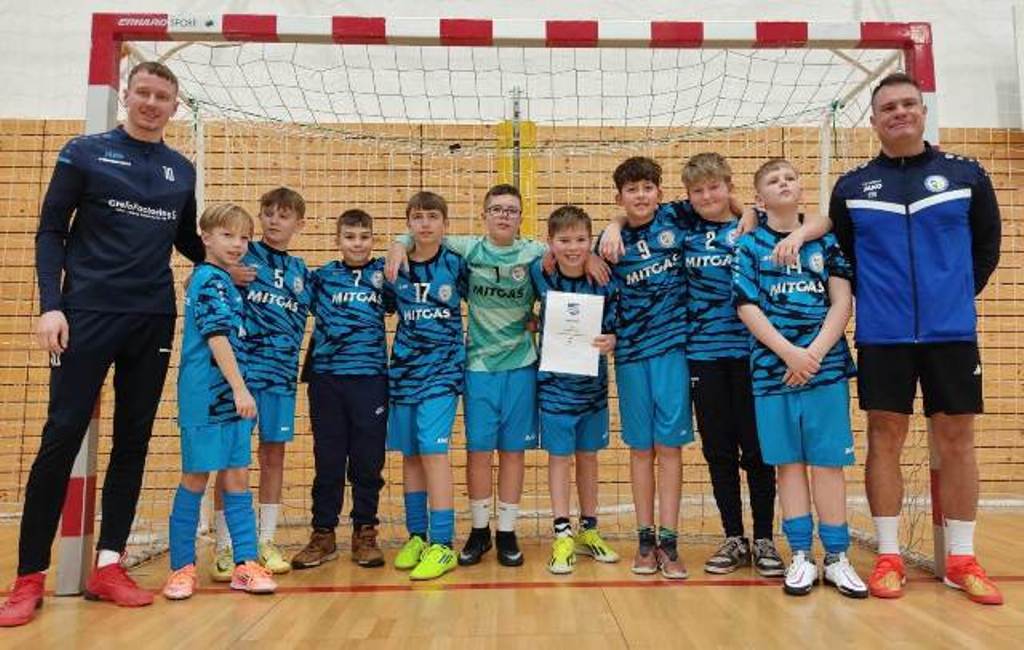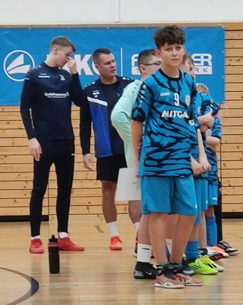 unsere Mannschaft von links: Co-Trainer Marius Baum, Felix Kretzschmar, Jonas Adam, Emilias Beier, Santiago Wilhelm, Theo Moritz, Stian Scoor, Benno Czastitz, Lio Zetzsche, Luis Schröder, Trainer Matthias Moritz