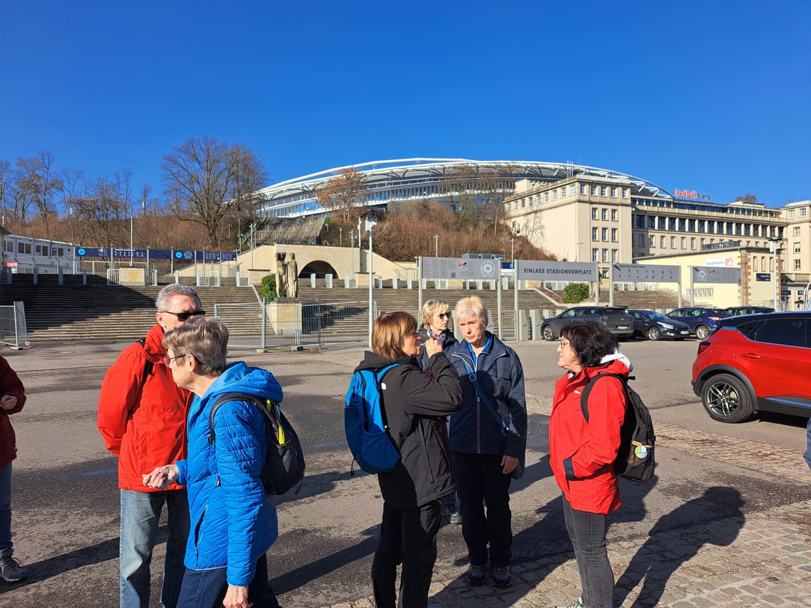 Nach 3 monatiger Pause war es endlich soweit und die „Flotten Füße“ stiegen ins Wanderjahr 2026 ein. Es waren 15 Wanderfreunde der W2 dabei. Neu begrüßen konnten wir in unserer Runde Bärbel und Ronald aus Schladebach. Wir fuhren mit 4 Fahrzeugen nach Leipzig zum Parkplatz der Red Bull Arena dem heutigen Startpunkt der Wanderung.