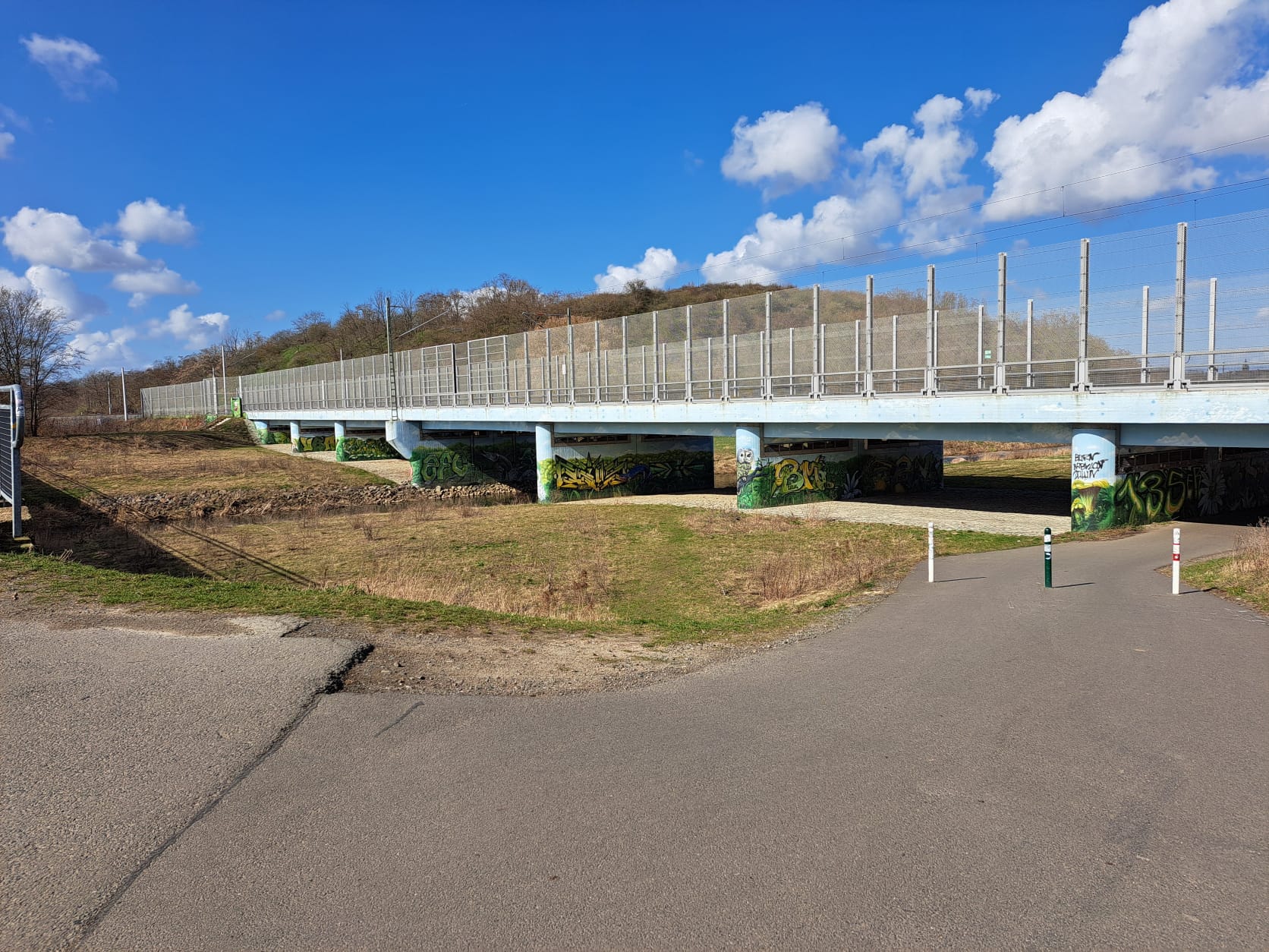 Mittlerweile hatten wir über die Hälfte unserer Wanderung absolviert, also waren wir auf den Rückweg. Wir kamen an der Bahnstrecke Erfurt Leipzig vorbei, im Hintergrund ist der Scherbelberg einige ehemalige Mülldeponie.