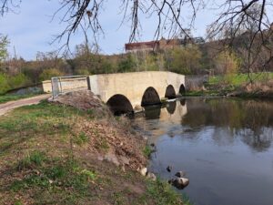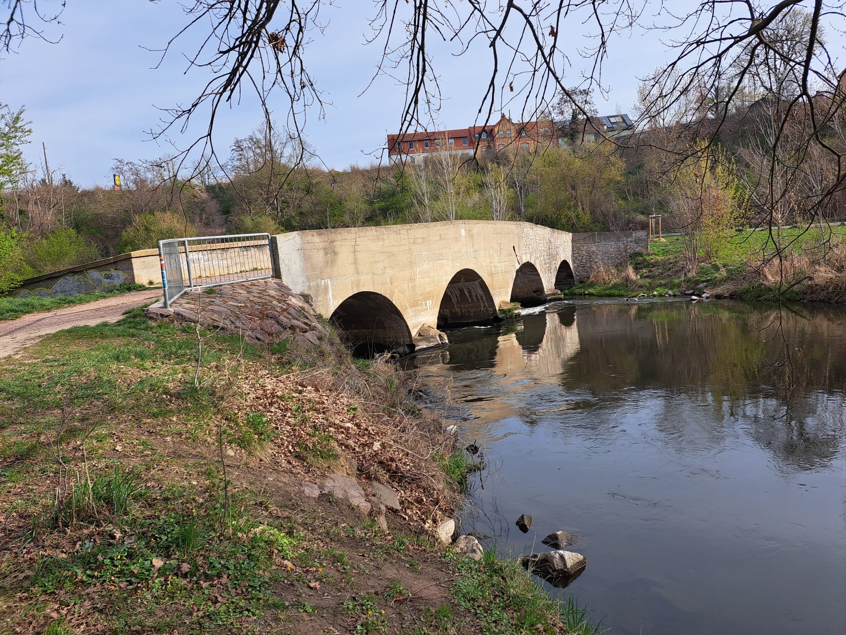Nach ca. 400m verließen wir die Straße und bogen abwärts in die Saaleaue ein unser erstes Ziel war die „Schafbrücke“,die über die „Weiße Elster“ führt.