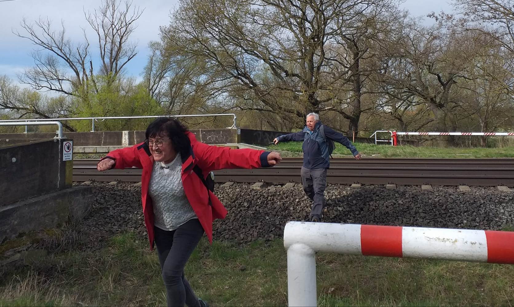 Kommt da ein Zug? Aber schnell breiteten Dagmar und Rainer die Flügel aus und segelten über die Gleise. Zum Glück war keine Bahnpolizei in der Nähe.