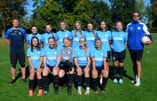 Hinten, von Links: Co-Trainer Yves Herrnann, Helena Kanähle, Charlotte Oeser, Anna Clara Lemmnitz, Milena Kuhl, Luisa Karin Naumann, Samira Beyer, Joane Heinold, Trainer Marco Beyer