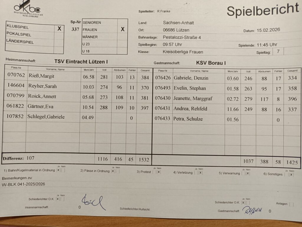Ergebnis Kegeln Frauen 15.02.
